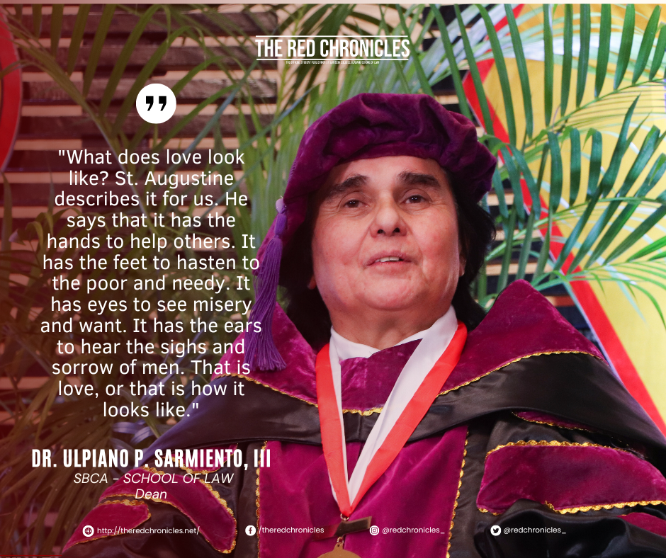 This question is that I would want you to begin pondering as early as now as you will no longer be with me here in this campus. It is my hope that you remember this when the time comes, for you to decide on what to do after the bar. Among all the jobs, all the offers that will be, of course, brought to you and you will gladly accept a fervently pray; that you intentionally nurture within you a deep joy, and make us but also yourselves proud and happy.