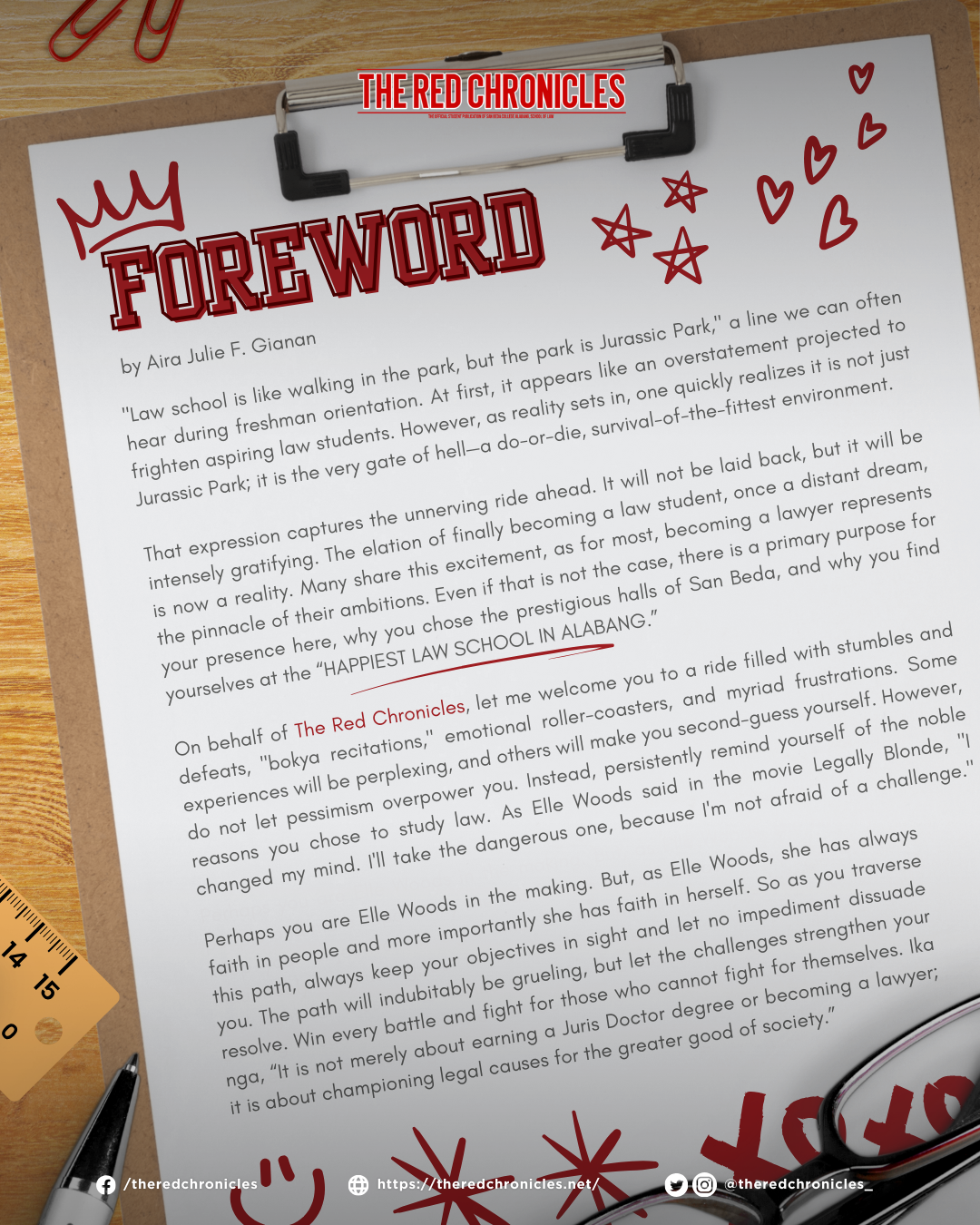 On behalf of The Red Chronicles, let me welcome you to a ride filled with stumbles and defeats, “bokya recitations,” emotional roller-coasters, and myriad frustrations. Some experiences will be perplexing, and others will make you second-guess yourself. However, do not let pessimism overpower you. Instead, persistently remind yourself of the noble reasons you chose to study law.