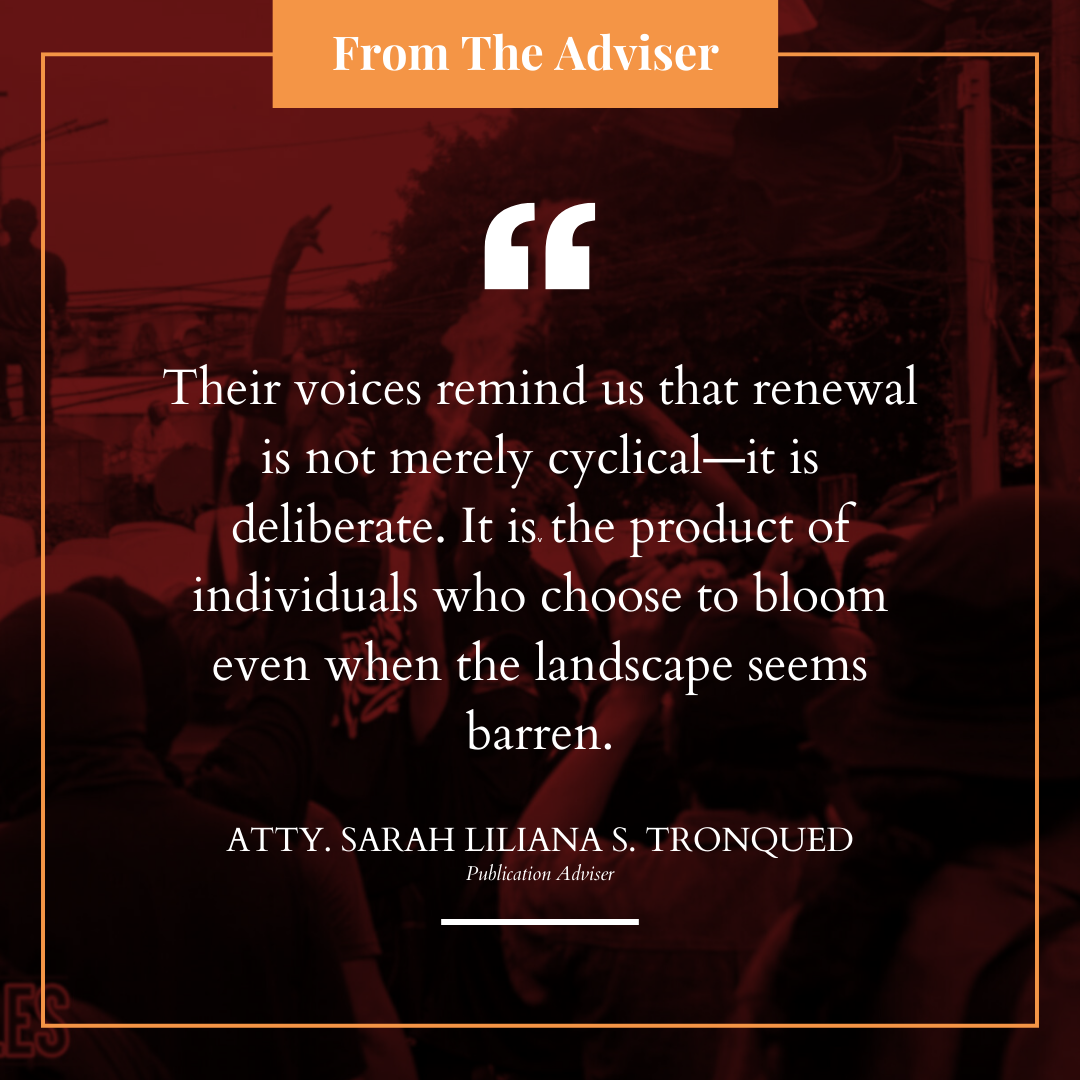 As legal scholars in training, you are uniquely positioned to analyze, critique, and contribute to the evolving narratives of democracy and justice in our region. May this issue inspire you to view the law not only as a system of rules but as a living instrument through which renewal—both personal and societal—can be pursued.