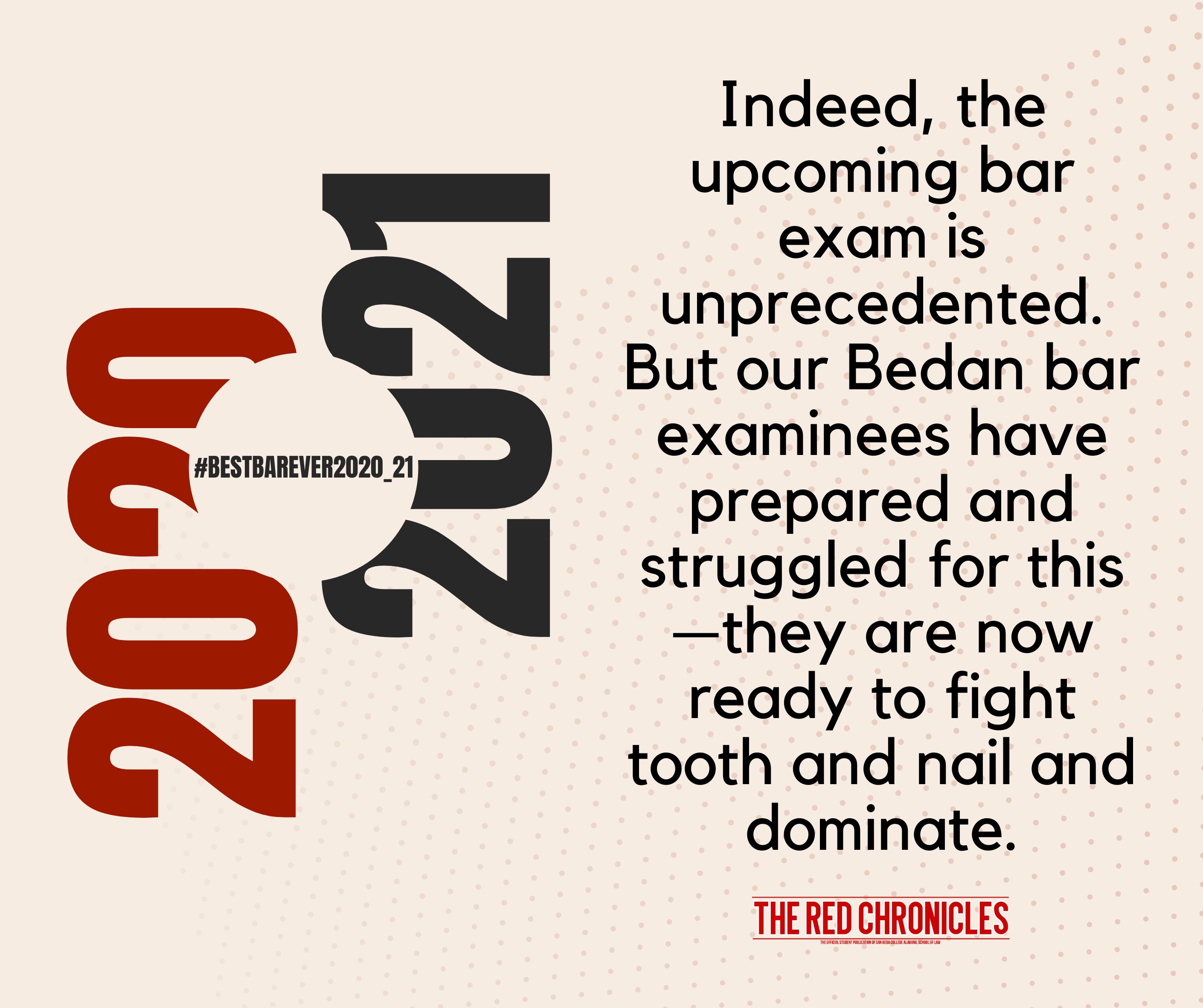 Indeed, the upcoming bar examination is unprecedented. But our Bedan bar examinees have prepared and struggled for this—they are now ready to fight tooth and nail and dominate. ∎
