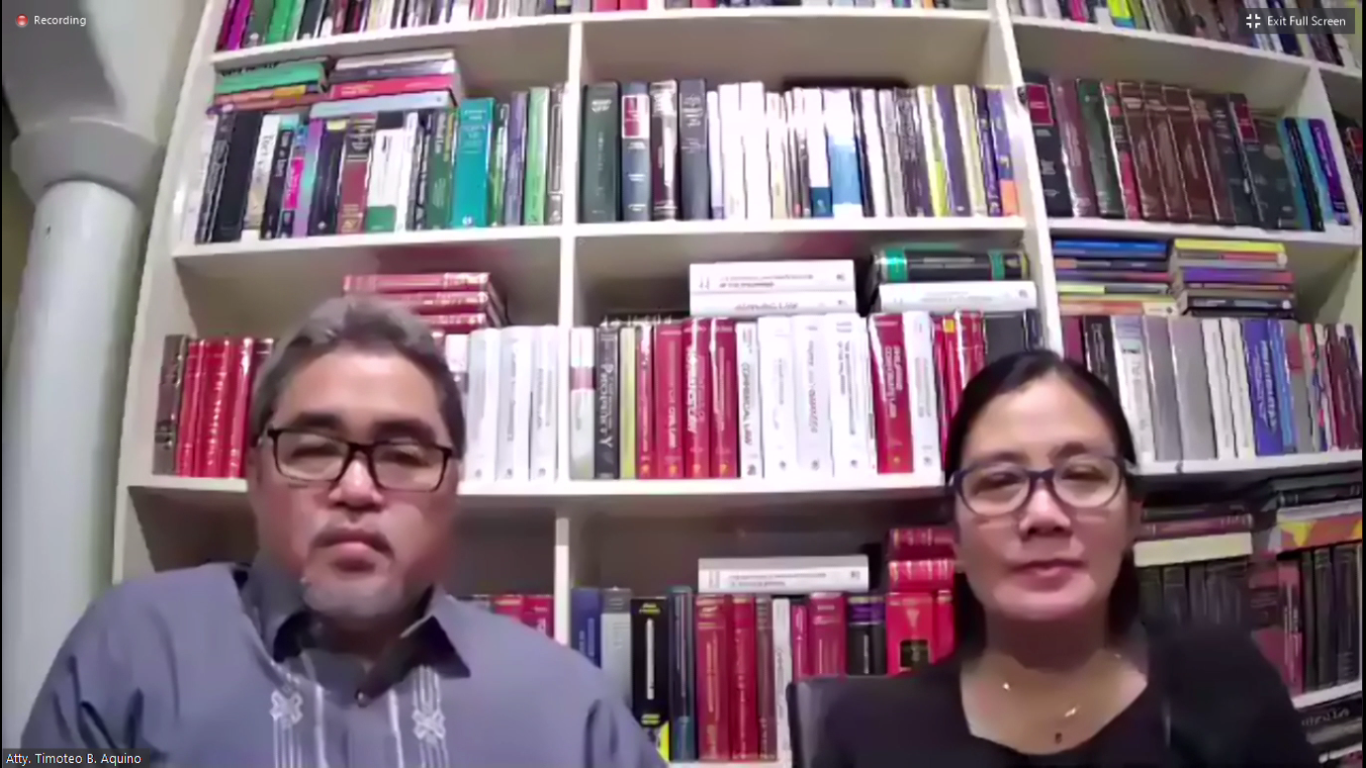 On 9 of November 2020, REX Book Store Inc. (RBSI) held an online book launch and lecture via Zoom, for their newly released title covering the Revised Corporation Code of the Philippines. Attended by professors, lawyers and law students from various schools, host Dianne Formoso of Rex Book Store Incorporated (RBSI) introduced the book, titled Comments and Jurisprudence on the Revised Corporation Code as well as the authors; the powerhouse couple of Atty. Timoteo Aquino (law professor, pre-bar reviewer and MCLE lecturer) and Atty. Maria Margaret Bernadette A. Aquino (former Assistant VP of the Legal Department and International Banking Sector of the Philippine National Bank). Atty. Timoteo Aquino is also a member of the SBCA-SOL faculty. He teaches Negotiable Instruments Law and Commercial Law Review.