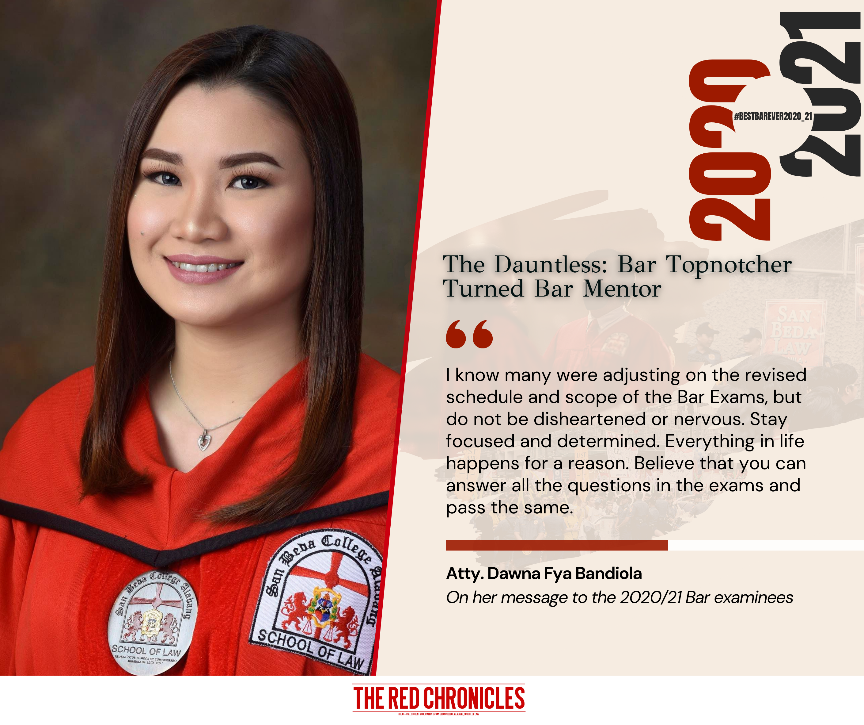 Atty. Dawna Fya Bandiola shared in an exclusive interview with The Red Chronicles her experience in preparing the barristers set to take the Bar Examinations on February 4 and 6, 2022. She started to mentor back in 2020 when the SBCA Centralized Bar Operations (SBCA-CBO) reached out to her. Hesitant at first, being a new lawyer at that time, she later accepted the offer after realizing that it would help a lot of barristers in preparing for the Bar. She also wanted to share her thoughts, techniques, and experiences to them.