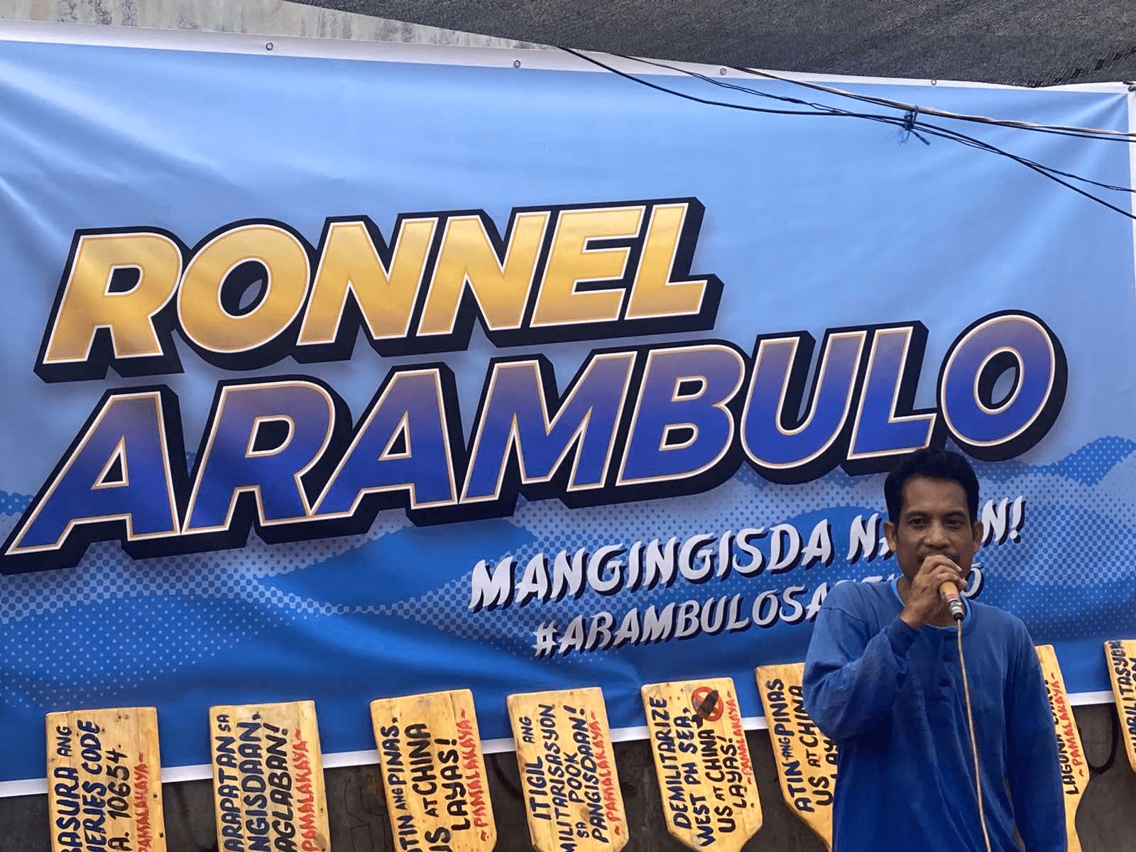 In his candidacy press photos, Arambulo is indeed different from your usual Senatorial prospects. With either a body of water or wooden paddles as his backdrop, he wears normal clothes, a reflection perhaps of his background as a fellow fisherman. There are no flashy attempts at campaigning, no ostentatious efforts in conveying his plans for the poor. Straightforward statements are written on the wood paddles in bold hues — ‘Ibasura ang Fisheries Code by R.A. 10654’; ‘Karapatan sa Pangisdaan, Ipaglaban!’; ‘No to Reclamation, Save Manila Bay!’ — and they are neatly lined up behind him as he speaks to a microphone at the people watching.