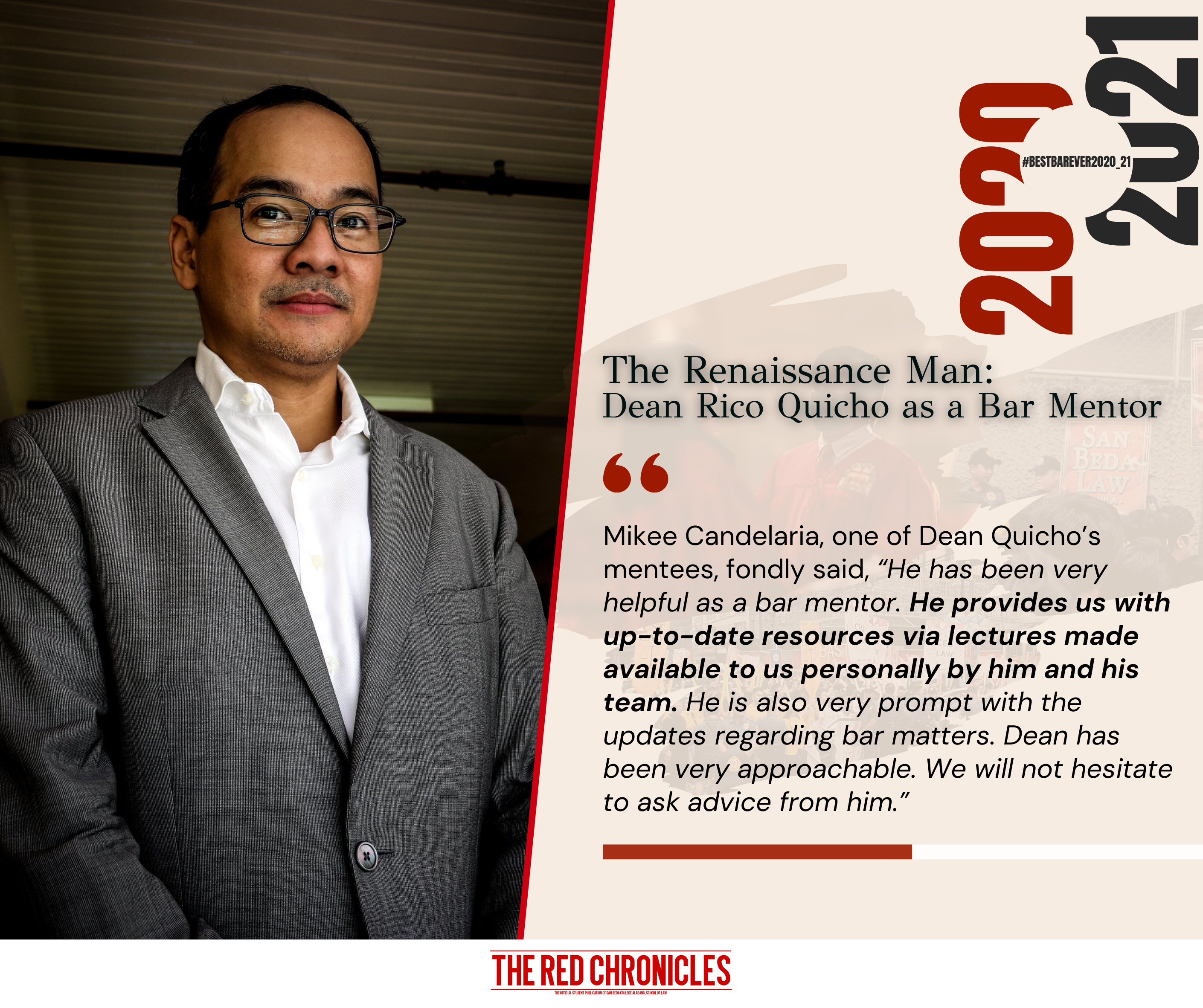 Mikee Candelaria, one of Dean Quicho’s mentees, fondly said, “He has been very helpful as a bar mentor. He provides us with up-to-date resources via lectures made available to us personally by him and his team. He is also very prompt with the updates regarding bar matters. Dean has been very approachable. We will not hesitate to ask advice from him.”